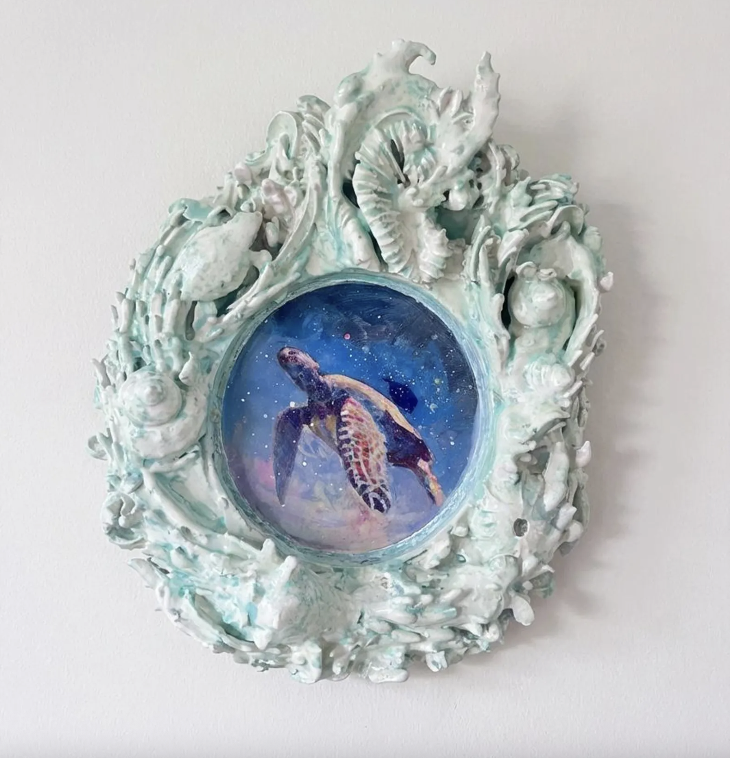 In addition to ready-made designs, collectors can contact Scout Cuomo to create a custom recycled plastic frame that incorporates meaningful elements — from specific sea life and botanical motifs to symbolic forms that reflect personal stories. Each custom frame is developed in collaboration with the artist, allowing clients to participate in the design of a one-of-a-kind sustainable art object.